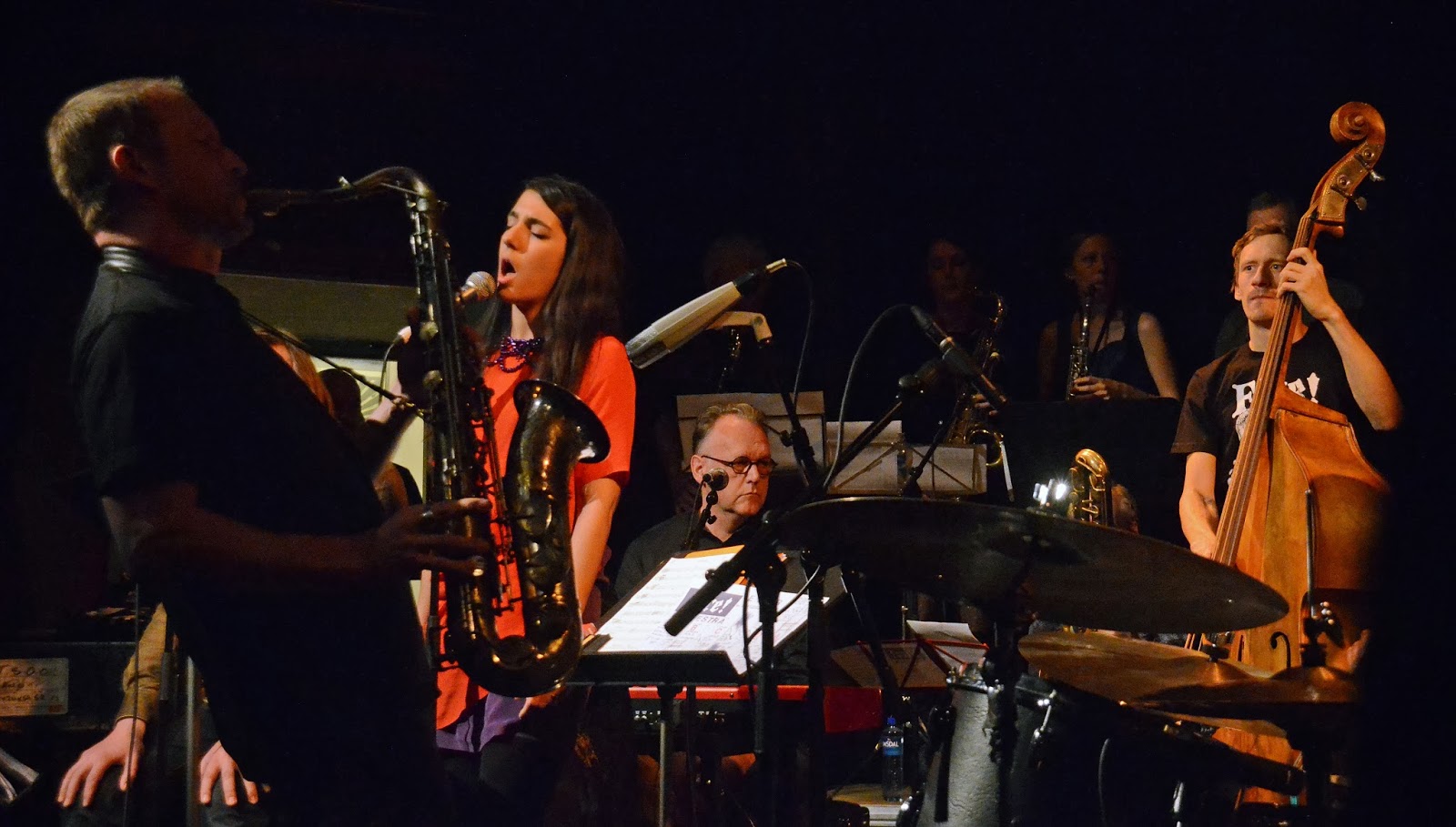 de fylte opp Nasjonal Jazzscene, det lille scenegulvet med mange av sine aller beste jazzmusikere, to kvelder på rad, disse bildene er fra i går kveld. Nesten 30 musikere, 3 trommiser, 2 kontrabassister, elbass, tuba og basssax, full saxrekke og trompetrekke, trombone, elpiano, 2 gitarister, samt 3 vokalister, samtlige av disse fra eliten av svensk jazz. Og de (altså